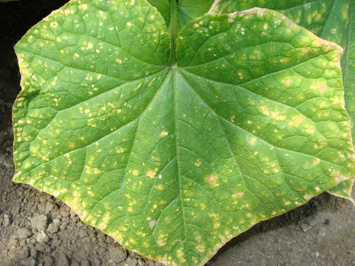 Желтые пятна появляются вследствие солнечного ожога, это характерно прежде всего для тепличных огурцов. В жаркие дни капельки конденсата попадают на листья,обжигают их и мы видим на огурцах бледно-желтые пятнышки.