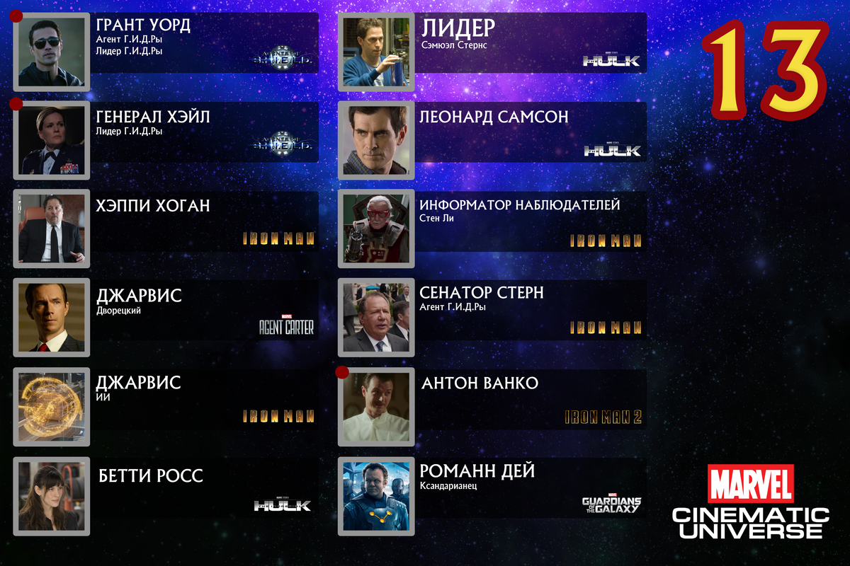 Уверен, после просмотра фильма "Мстители: Финал" у многих в голове возник вопрос: "А сколько же всего персонажей покинуло страницы комиксов и предстало в новом амплуа на экранах?" Что же, попробуем сосчитать их всех. Перед вами вторая часть, но все равно, напомню о небольшой инструкции: 1. Красный кружок в верхнем левом углу фото героя означает смерть персонажа в киновселенной. На текущий момент. 2. В нижнем правом углу рамки с именем указан фильм или сериал, в котором персонаж появился впервые. Итак на момент второй части мы имеем суммарно уже 144 персонажа. Если вам не наскучил мой неторопливый и доскональный подсчет, то поехали дальше: ОСТОРОЖНО: в этот раз можете словить спойлеры к сериалам! Тринадцатый блок: Грант Уорд, Генерал Хэйл, Хэппи Хоган, Джарвис: Дворецкий, Джарвис: ИИ, Бетти Росс, Лидер, Леонард Самсон, Информатор Наблюдателей, Сенатор Стерн, Антон Ванко, Романн Дей; Суммарно персонажей: 156 Четырнадцатый блок: Ирани Риэль, Эго, Мередит Квилл, Берит, Ка