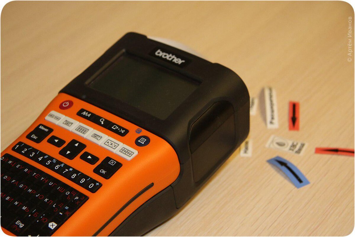 Принтер для печати наклеек Бразер. (Brother). Это мобильный принтер с собственной клавиатурой. Наклейку можно создать мрямо с клавиатуры. Удобнее конечно это делать со смартфона или ещё более удобно с компьютера. Печатать с компьютера можно через провод, как в случае с обычным принтером, так и через Wi-Fi связь. Мы делаем наклейки на трубы. Сразу же на них печатаем пиктограмму и подпись, что именно запитывает конкретная труба. Делаем стрелочки направления «синей» или «красной» воды. Система выглядит более понятной и это удобно. Данный принтер может печать наклейки на лентах от 3 до 24 мм. Если ширины 24 мм мало, то можно сделать наклейку в «4 этажа», и наклеить как бы одну над другой. Таким образом получается максимальная ширина составной наклейки уже не 24, а 84 мм. Правда придётся поработать ножницами. Но для отрезания поперёк есть автоматический нож. Можно печатать на лентах для тканей, можно даже делать гравировку на металле. Наклейки не выцветают. Когда на ютубе мне кто-то утв