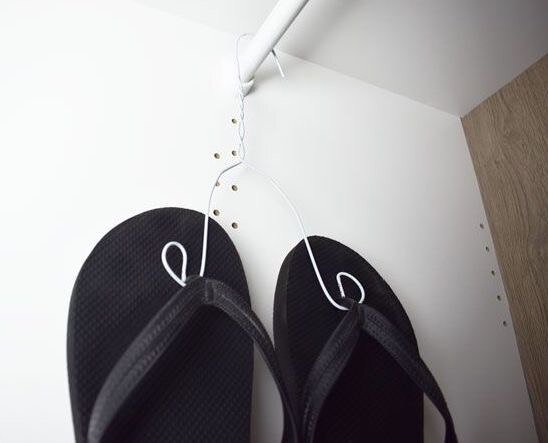 Слишком много обуви и негде её хранить? Давайте разберемся с этой проблемой вместе. Мы подготовили для вас несколько полезных советов, облегчающих эту задачу: 1. Сделайте маленькие вешалки для вашей обуви Это, пожалуй, самая милая идея хранения обуви, которую мы когда-либо видели! Вы можете сделать небольшие вешалки для вашей обуви, используя обычные проволочные вешалки. Это позволит вам повесить практически любой тип обуви. Разрежьте пилой ( или используйте кусачки) нижнюю часть вешалки, а затем оберните пару слоев изоленты вокруг получившихся концов. Подкрутите их в колечки и повесьте на рейл. Ищете больше идей для хранения в шкафу? Если вы прикрепите карниз к нижней части своего гардероба, вы сможете использовать это пространство наилучшим образом! Например, для вешалки с обувью. 2. Прикрепите полотенцесушители к стене. Один из самых дешевых способов сделать собственную версию подставки для обуви IKEA - это установить несколько дешевых полотенцесушителей в задней части вашего