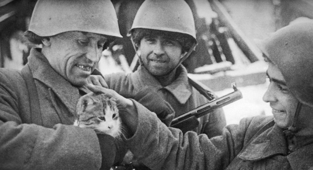 Когда в 1944 году в Белоруссии батарея зенитной артиллерии, проходящая через освобождённые сёла, остановилась на привал в одной спалённой деревушке, в которой кроме колодца ничего не уцелело, вокруг не было ни одной живой души, и вдруг батарея встречает Рыжика. Он последний выживший в этой деревне. Вот это характер и сила воли! В итоге старшина накормил бедного кота и записал его как седьмого бойца батареи, с расчётом что Рыжик будет защищать батарею от вездесущих мышей и крыс.