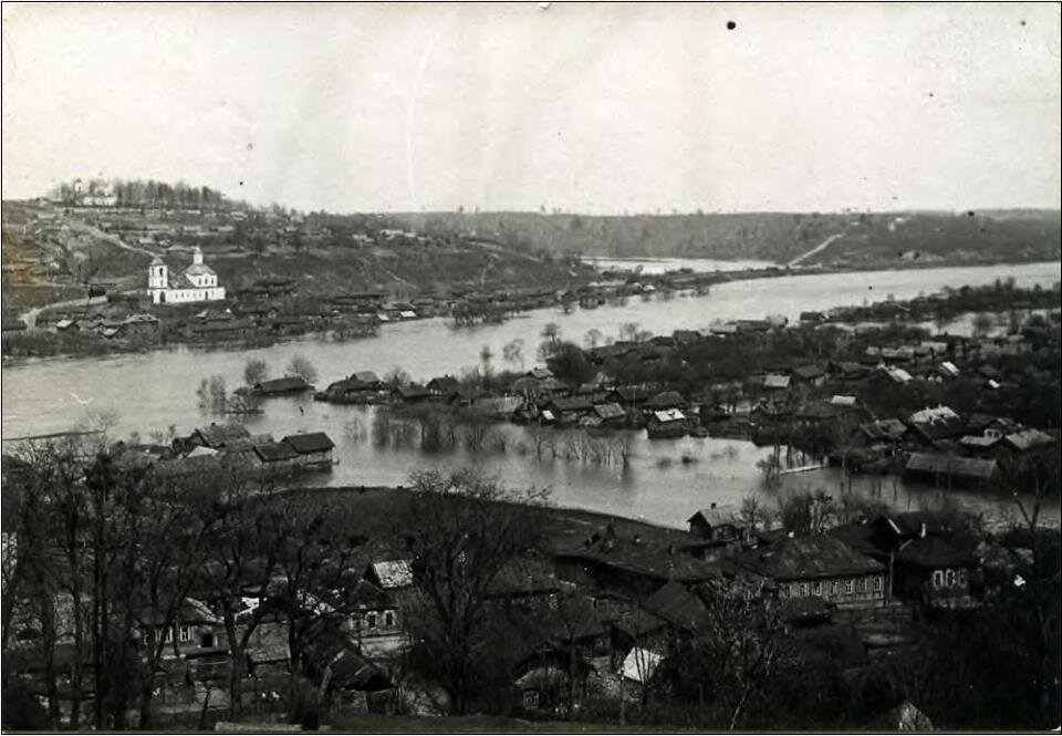 Наводнение 1908 года, охватившее почти все реки Европейской части, Верхней и Средней Волги, стало самым разрушительным в XX веке. Десятки тысяч людей остались без крова. Причиной большой катастрофы стала снежная зима, внезапное таяние снега и вместе с ним начавшиеся обильные дожди, которые длились более десяти дней. Страшное половодье пришлось на Страстную неделю. Праздник Пасхи, который пришелся на 13 апреля (ст. ст.*), удалось встретить не всем. В Смоленске к половодью готовились загодя, с конца марта 1908 г. Не ожидая, правда, что вода будет такой большой, городской полицмейстер обратился к городскому голове с просьбой предоставить для каждой из низовых улиц Смоленска по две-три лодки и больших размеров плотов. Вода в Днепре начала прибывать в ночь со 2-го на 3-е апреля, сначала на 18 сантиметров, на следующий день на 36 сантиметров, в ночь на 5-е апреля – больше чем на метр. Утром 8 апреля вода по водомеру показывала уже более 10 метров. Залитыми оказались улицы на Рачевке, п