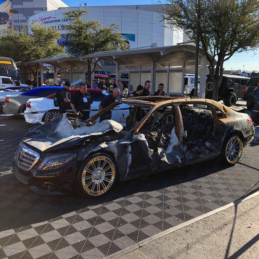 Полностью сгоревший Mercedes S-class как арт-объект. Шикарный ход маркетологов. Выставка Sema.
