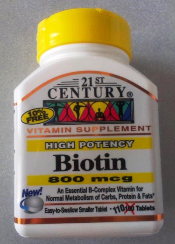 Никогда у меня не было проблем с волосами и особого ухода они никогда не требовали - мою через 2-3 дня шампунями, использую кондиционеры, маски, бальзамы, окрашиваю. Но вот стала замечать, что после мытья на решетке в ванной остается изрядное количество из моей шевелюры, решила, что нужно решать проблему изнутри. Как раз собирала очередной заказ на Айхерб, вот и решила посмотреть что предлагается для решения моей проблемы. Почитав информацию на сайте и отзывы в интернете, решила, что нужно попробовать Биотин... Биотин принадлежит к витаминам группы В и способствует выработке БЖУ, участвует в регенерации клеток, помогает выработке жирных кислот. Главные симптомы, которые говорят о недостатке биотина в организме и которые я выделила у себя: сонливость, депрессивность, высокий уровень холестерина, ухудшение состояния и замедление роста волос. В разделе пробных товаров, всего за 127 рубликов усмотрела витаминный препарат Biotin от компании 21st Century. Витаминная добавка предлагается в