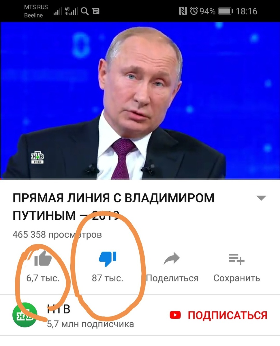 Реальный рейтинг доверия к президенту РФ В.В. Путину, показала недавняя "Прямая линия президента с народом", которую в прямом эфире транслировал канал НТВ на своем ютуб канале. Количество дизлайков в десятки раз превышает количество лайков, при этом данный показатель, ютуб скручивал во время всей трансляции. Такого массового негатива в интернете, выраженного дизлайками на трансляции президента, не было ни разу за все время прямых линий