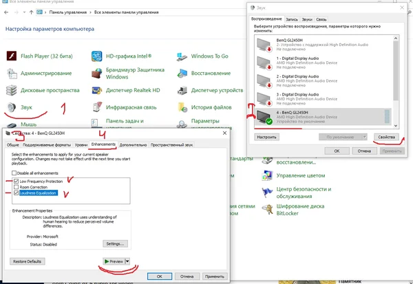 4. Выбираем вкладку "Enhancements". Кнопка "Preview" позволит определить уровень громкости, который у вас есть на данный момент (на слух). Ставим галочки напротив пунктов "Low Frequency Protection" и "Loudness Equalization".