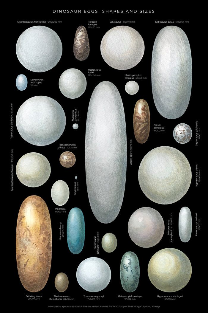 Предполагается, что все динозавры размножались, откладывая яйца. На данный момент описаны около 240 яиц динозавров. Более 100 000 яиц динозавров, относящихся к 20 разным видам, были обнаружены в месте гнездования в провинции Хэнань (Henan) в Китае. Но, несмотря на все открытия, существующие знания о яйцах динозавров все еще скудны. Сегодня известно около 1000 видов динозавров, из которых около 650 описаны более подробно. Но до настоящего времени достоверно описаны не более 160 различных яиц динозавров или фрагментов яичной скорлупы. И большинство яиц нельзя отнести к определенным видам динозавров. Профессору доктору К. Шлепферу (Kurt Schläpfer) удалось идентифицировать только 30 яиц, которые относятся к известным видам динозавров. На постере собраны практически все яйца, описанные профессором К. Шлепфером, для которых указаны длина и ширина. Тем не менее, в некоторых случаях для яиц одного и того же вида указываются достаточно противоречивые данные. Например, описаны четыре разных яйц
