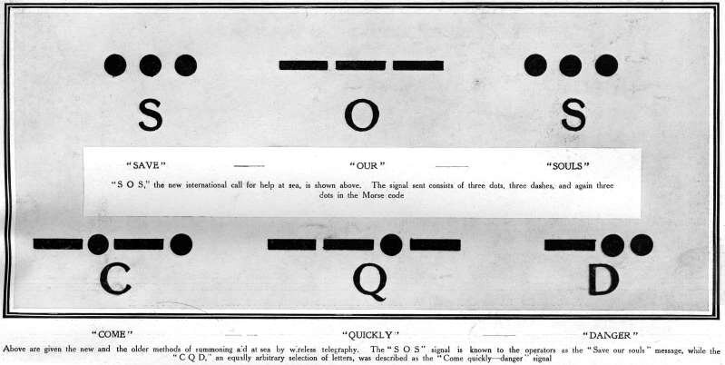 1. Предшественником SOS был сигнал CQD (— · — ·— — ·— — · ·), который также обозначал бедствие. Однако в 1906 году на Международной радиотелеграфной конференции представители разных стран решили выбрать новый сигнал, так как CQD было очень легко перепутать с CQ (— · — ·— — · —) — вызов для всех станций.