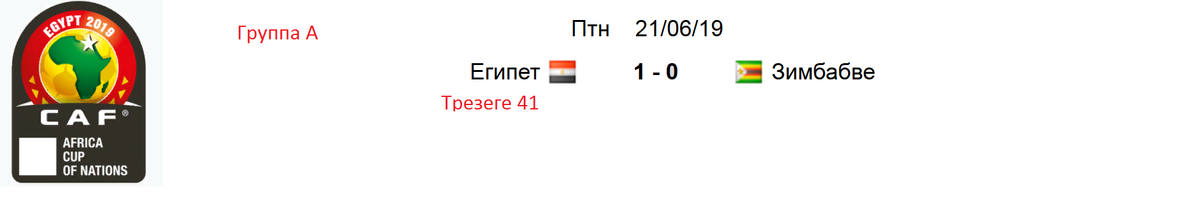 Сборная Египта в стартовом матче кубок африканских наций обыграла команду Зимбабве. Хочу оповестить вас, о том, что ряд сборных, среди которых и Зимбабве, были готовы бойкотировать турнир, из-за невыплат премиальных за квалификацию. Но Зимбабве свой матч провели. Значит всё утрясли. Трезеге, представляющий турецкий Касымпаша, автор мяча. Этот Трезеге не чемпион мира. Египет, который принимает этот чемпионат вместо Камеруна, выиграл свой первый матч и увеличил свою победную серию до 3 матчей с учетом товарищеских поединков. Последний раз команды пересекались 6 лет назад, в рамках подготовки к чемпионату мира, египтяне дважды обыграли зимбабвийцев. Турнир обещает быть жарким, ведь 58-я команда мирового рейтинга с трудом одолела 109-ю. В группе А играет Демократическая республика Конго и Уганда, которые занимают в рейтинге ФИФА 49-е и 80-е. Несмотря на то, что это второй матч турнира, он прошел на том же стадионе в столице Каир. Очень неожиданный результат в пользу команды из