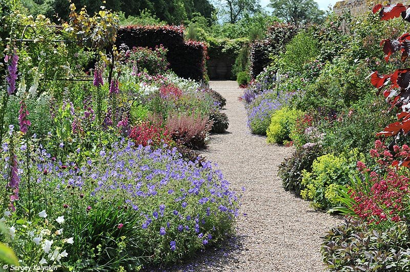 Продвинувшись на север, я посетил два классических английских коттеджных сада - в Уорвикшире и в Шропшире. Первым был Coughton Court, что в городе Алстере. Сад принадлежит National Trust, который сохраняет британское архитектурное и садовое наследие. В этот сад многие едут именно для того, чтобы посмотреть на интерьеры дома. Но меня, конечно, интересовал сад. А точнее, совокупность разных садиков, из которых он состоит. При доме - формальный, в кирпичных стенах - аж два сада. Первый - квинтэссенция традиционного английского коттеджного сада. Он тоже разбит на тематические уголки: сад с солнечными часами, например, или тематические колористические сады. Второй сад в кирпичных стенах - два глядящих друг на друга длинных миксбордера. В первом больше синего, во втором - желтого. Кроме этого было еще много мелких садиков, две церкви, большой фруктовый сад и симпатичный огород. А также болотный сад вокруг мелкого пруда. Мне кажется, правильно, что этот сад закрывается в 17-00, потому что веч