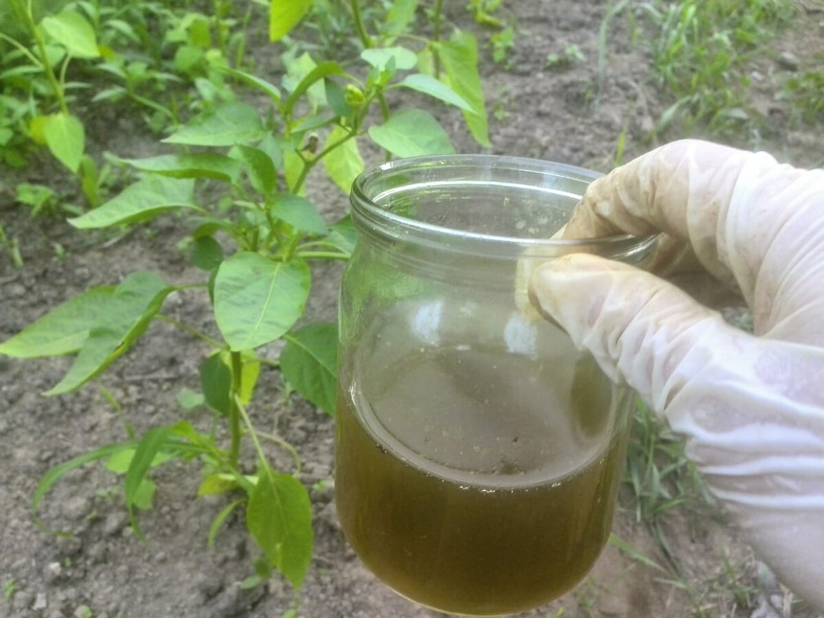 Поэтому из кастрюли с коровяком взяла 1,5 литра раствора и развела в 10 литрах воды. Именно этим раствором полила свой перец в теплице по влажной почве.