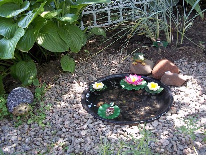 1. Тазы Старые ёмкости послужат для обустройства мини-водоёмов. Сначала нужно осмотреть тазик, на наличие дыр в дне. Если они все же есть, то проблему легко решить: положить вниз целлофановую плёнку или замазать отверстия строительным гипсом. Он более предпочтителен, так как заселённым в пруд лягушкам легче выбираться по нему, чем по плёнке.