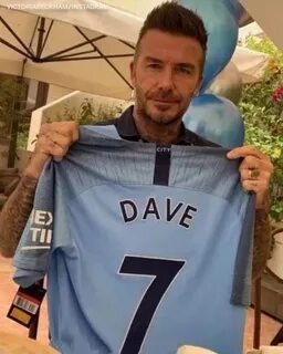 44-летний британец, отыгравший 10 сезонов за «Манчестер Юнайтед» получил в подарок футболку «Манчестер Сити» — одного из главных соперников «красных дьяволов». Вместо фамилии на футболке выбито уменьшительно-ласкательное от имени Бекхэма — Дэйв.