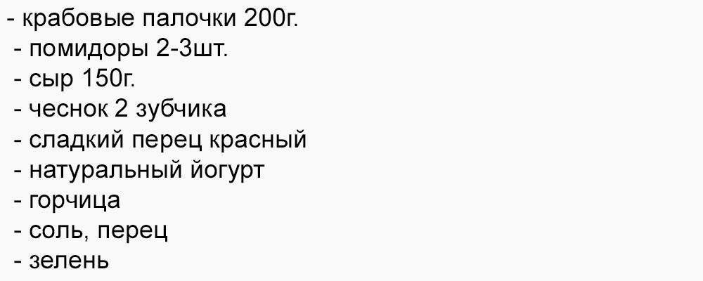 Этот салат на столько популярен, что рецепт стремительно облетел весь интернет. Мой рецепт диетический, мы же худеем. Ну или держим себя в форме. Но от этого салат не менее вкусный. Нам понадобится: Как готовить: Помидоры, перец нарежьте соломкой. Палочки измельчите, как вам нравится. Сыр натрите на крупной терке. Для заправки смешайте натуральный йогурт, чеснок, соль, перец, горчицу. Заправьте салат заправкой, перемешайте. Подавайте с зеленью. Вот так просто, вкусно и без вреда для фигуры! В классическом рецепте в качестве заправки используют майонез. Будьте здоровы! А для меня лайк и подписка на канал!
