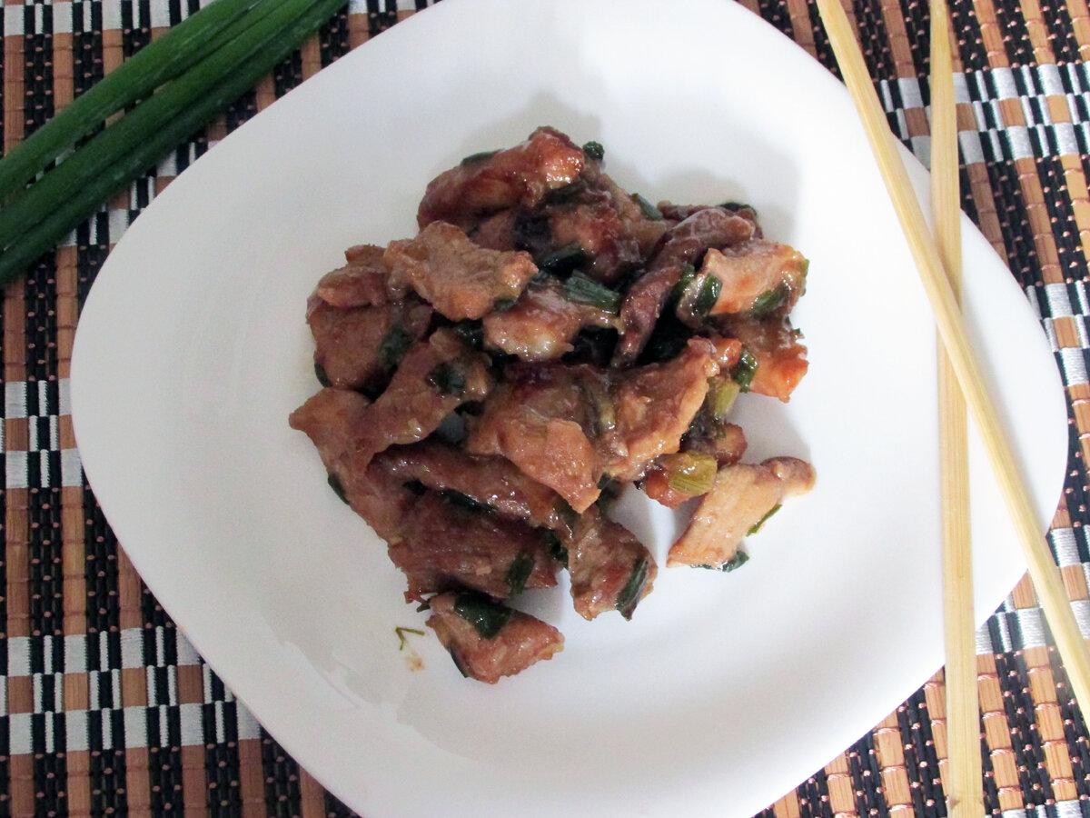 Вкусное и ароматное мясо в восточном стиле. Продукты, которые нам нужны для приготовления свинины с зеленым луком: - около 500 г свинины (лучше брать не очень постное мясо, чтобы не получилось сухим); - большой пучок зеленого лука (примерно 150 г); - растительное масло. Для маринада: - 2 столовые ложки любого соевого соуса; - 1 столовая ложка воды; - несколько зубчиков чеснока; - 1 чайная ложка сахарного песка; - 1 столовая ложка растительного масла (подсолнечное, оливковое и т.п.); - 0,5 столовой ложки картофельного крахмала; - 0,5 столовой ложки рисового вина (можно заменить любым коньяком). Для соуса: - 1 столовая ложка любого соевого соуса; - 0,5 чайной ложки сахарного песка; - 1 столовая ложка воды; - красный перец по вкусу (я брала примерно ¼ чайной ложки). Приготовление свинины в соусе с зеленым луком: Свинину порезать небольшими кусочками. Чтобы ее было легче резать, лучше брать немного подмерзшее мясо. Для маринада смешиваем соевый соус, воду, сахар, мелко-порубленный чес