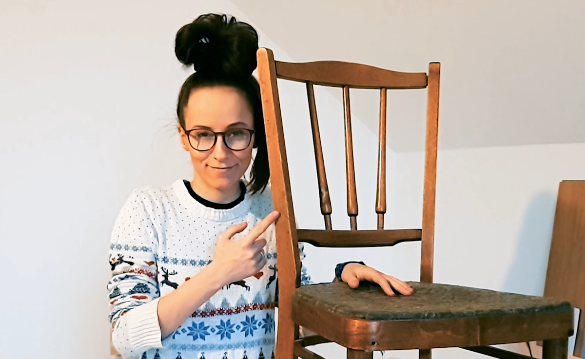 Я начала с осмотра моего стула. Что мы имеем? Какие-то вандалы пытались его починить народными способами. Вкручивая саморезы, добавив бинтика. Все расклеилось и покрыто лаком.