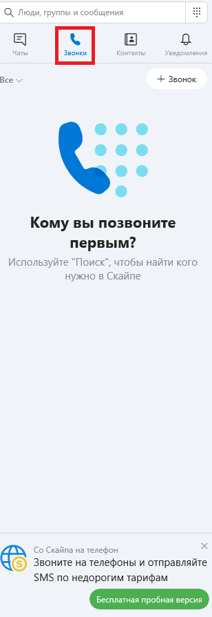 В жизни случаются различные ситуации. Но довольно неудобно, когда на телефоне заканчиваются деньги, а позвонить нужно срочно. В подобной ситуации не обязательно бежать к ближайшему терминалу пополнения. Данная ситуация решается довольно просто. Для этого Вам понадобится просто позвонить через любой мессенджер. Но что же делать если у того, кому Вы собираетесь звонить нет интернета или мессенджера. В таком случае на помощь придёт старый добрый Skype. Да, с него можно звонить и на мобильные телефоны по всему миру. Конечно данная услуга стоит денег, но изначально Вам будет доступен целый месяц пробного периода. И хотя добраться до него не просто, но мы постараемся это сделать. Что ж, начнём. 1. Для начала запускаем Skype или регистрируемся и запускаем. Далее выбираем вкладку "Звонки". 2. Внизу мы видим надпись "Бесплатная пробная версия". На неё и нажимаем. 3. В открывшемся окне видим варианта с оплатой за минуты и подписку на безлимитные разговоры с Индией (или с другой страной) с беспл