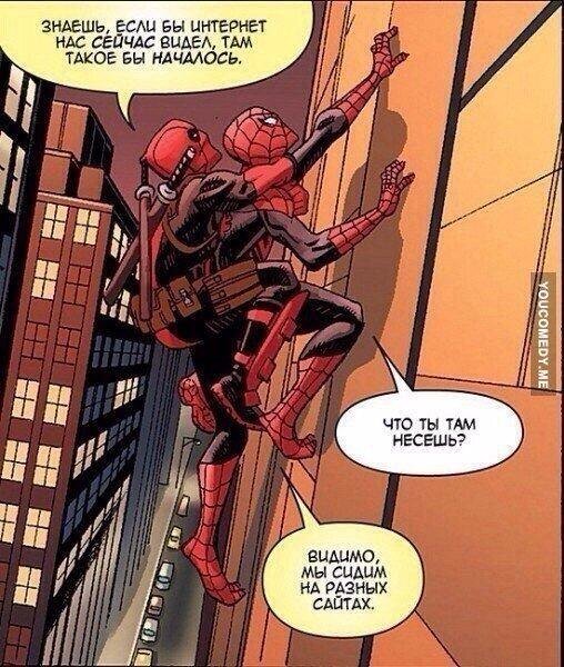 Вообще Дэдпул относится к Пауку, как к младшему брату, но фанфики говорят об обратном... Но иногда может и перепутать что-то. Не стоит забывать, что у него, всё-таки, опасная работа. Иногда можно что то перепутать. Или получить люлей... А это кадр из "Дэдпул убивает вселенную Марвел" Как-то раз он у ил чувака, который в комиксах про Дэдпула увидел свою же смерть за минуту до выстрела. Рекурсия: А Наблюдатель-фанат Дэдпулов. Дэдпул и Каратель: Дэдпул на заданях: А вот очередная "наркомания" в его комиксах😁