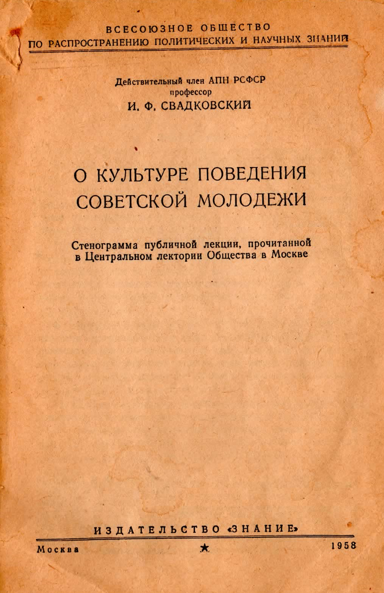 Не представляю, откуда у меня эта "инкунабула". Невозможно, чтобы мои родители вдруг отправились на подобную лекцию и тем более, приобрели "Стенограмму", выпущенную тиражом 395 тысяч экземпляров в 1958 году. Но я нашла это в бумагах и решила изучить, чему Профессор Свадковский учил молодежь хрущевской оттепели. Начал Профессор с Ленинских критериев и эксплуататорских классов: Т. е Пушкин был эксплуататором? Да нет, наверно он просто был не в курсе "Ленинских критериев". Но я рада, что дуэли не рекомендованы советским молодым людям. Далее лектор перешел к привычкам. Хорошие велено развивать, дурные искоренять. Не очень поняла, как "чувство плеча в рабочем коллективе" поможет перестать "громко чавкать", но Профессору было виднее. Про хорошие привычки: Привычка приходит на помощь. Привычка поднимать перчатки. Потому что я не знаю даму, которая обернулась бы на "товарищ". Хотя, возможно 60 лет назад это было принято... Но тогда я понимаю, почему у нас до глубокой старости всех "девушками"