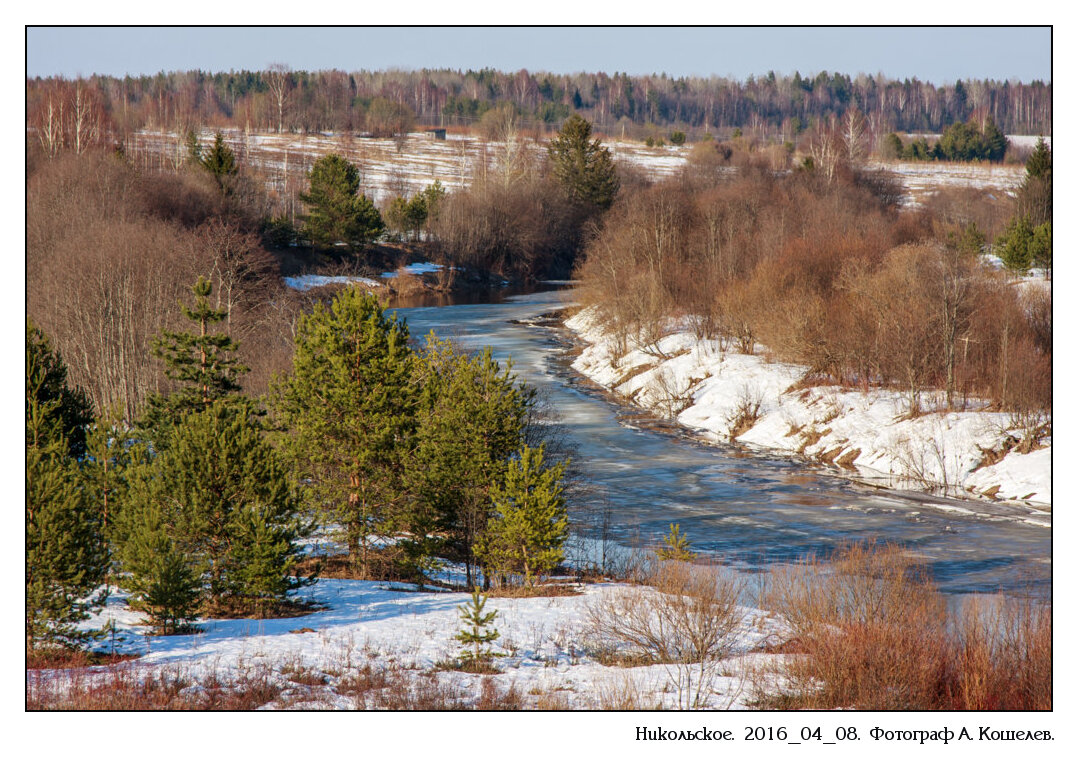 Облачное утро. К обеду начало распогоживаться. Солнце, лёгкие облака. Решил прогуляться к Кузнечихе. По дороге в лесу кто то кричит. Из птиц. Раньше тут канюки жили. Не узнал и не увидел в этот раз. От шоссе есть дорога до Кузнечихи и дальше в лес. Лесовозная, разбитая, грязная. В низинах ручьи журчат. Снега не много, проталины везде. Дорога на Левакшу повернула, а я на угор пошел. Солнце ещё высоко, снимать то особо и нечего. Привычный уже вид на речные просторы. На небе пёрышки облаков, на реке лёд. Проталин мало. На старице воды много. Лёд стоит. Десяток кадров. Просто отметиться. Повернул к деревне посмотреть на дорогу к реке Левакше. Далеко не прошел. Гать, по гати грязь лесовозами раскатанная. Сапог не вытащить. Прошел по деревне, вернулся на околицу. Над деревней большие птицы кружатся. Чибисы. Пробовал поохотится, но близко не подпускают. Кадров много, да толку мало. Понемногу время к закату подошло. Солнце в мутных облаках, силуэты домов и деревьев. Уже и к дом