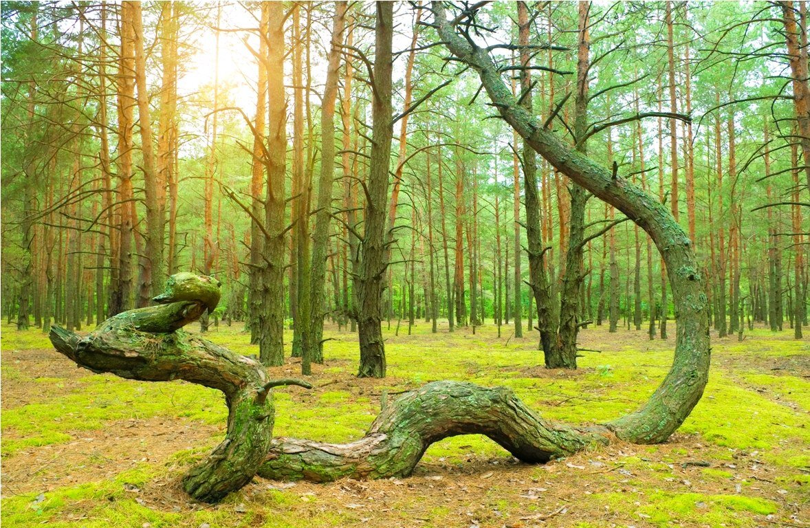 в некоторых местах, рядом с нормальными(прямыми) деревьями, растут деревья закрученные по спирали