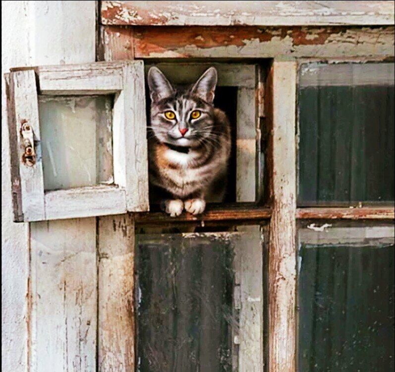 В проеме форточки стоял кот, держа в зубах огромную свиную ногу.
