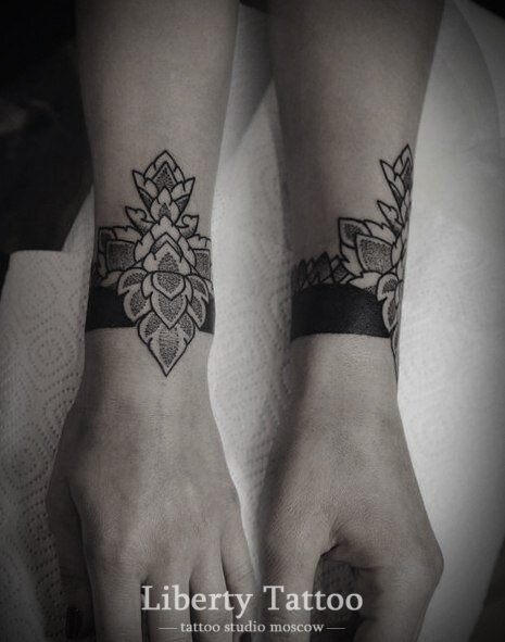 Значение тату браслеты варьируется в зависимости от места расположения и стиля самого рисунка. Браслет набивают на руку или ногу. Это может быть имитация украшения, переплетение букв, символ или цитата. Считается, что браслет привлекает удачу, а набитое украшение из славянских или кельтских символов — мощный амулет, дарующий обладателю защиту. У древних греков браслет на руке символизировал вечное повторение временного цикла, поэтому дополнительно татуировка означает бесконечность, гармонию, цикличность. Тату браслет: эскизы и фото. Татуировка браслет размещенная на коже выглядит очень эффектно и привлекательно. Самые распространенные варианты тату с браслетом: Обратившись в тату салон Москвы «Либерти» вы можете сделать тату в виде браслета в любом понравившемся вам стиле. Интересные фото тату браслет можно увидеть в нашей галерее, чтобы подобрать идею для своего рисунка. При желании для каждого клиента может быть разработан уникальный эскиз тату браслет, отвечающий всем требованиям