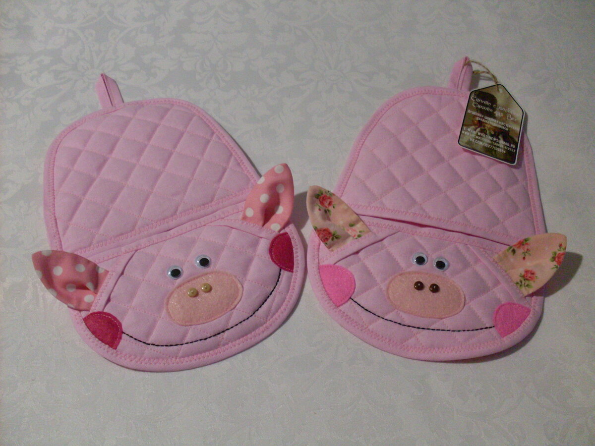 Доброго времени, дорогие рукодельницы и все, им симпатизирующие! Сегодняшний МК я хочу посвятить изготовлению прихватки в виде забавной свинки. Прихваточки, как известно, всегда нужны на кухне) Итак, с чего начнём? Перво - наперво, нарисуем выкройку желаемого размера. У меня выкройка вот такая. Вырезаем выкройку. Припуски на швы нигде давать не нужно! Все срезы прихватки будем окантовывать, а в выкройке ушек припуски уже заложены в конструкцию. Выкраиваем прихватку из розовой бязи. Всех деталей должно быть по одной. Совет: перед раскроем продекатируйте (проутюжьте с паром) все ткани, чтобы они дали усадку. Теперь приступаем к заготовке деталей прихватки. Делаем разметку будущей стёжки на верхней и нижней деталях передней части прихватки. Я сделала разметку ромбами со сторонами 2*2 см. Намечала линии портновским мелом. Вы можете воспользоваться им или мылом, или исчезающим маркером — кому как удобно. Затем из синтепона и белого ситца вырезаем подложки к данным деталям. Они должны быть