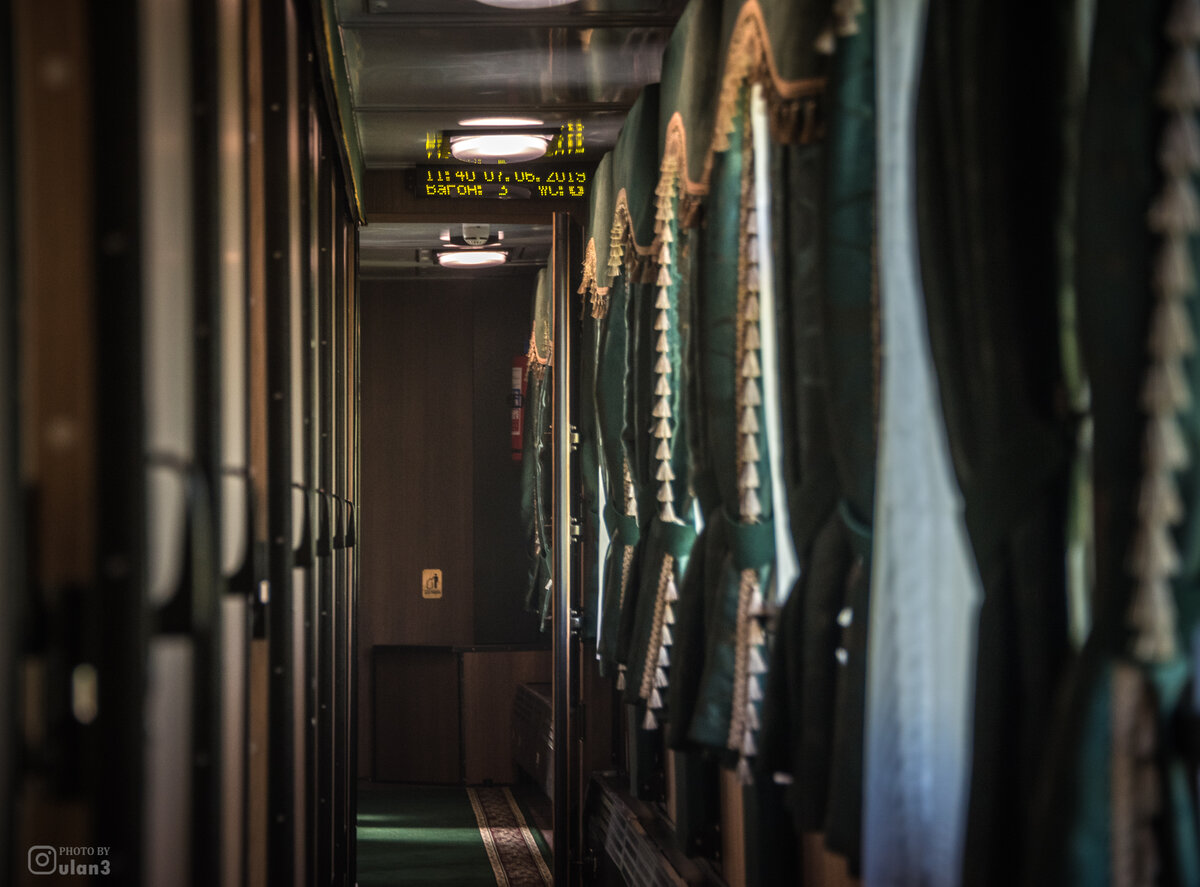 Интерьер поезда выполнен в стиле прошлых эпох - конца 19 - начала 20 веков. Вагоны - старые, добрые аммендорфы, или как их прозвали - "немцы". По проходу постелен мягкий зелёный ковёр, а на окнах висят красивые шторы того же приятного цвета.