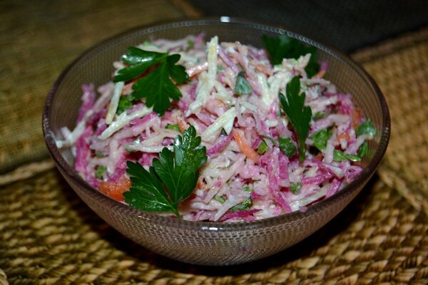 Добавив к богатой витаминами репе не менее полезные морковку и арбузную редьку, получим вкусный и питательный салатик. Рецепт этого салата гарантировано понравится сторонникам здорового питания. Вкус салата приятный и мягкий, особенно если использовать для заправки салата сметану. Выход: 2 порции. Время: 15 мин. Продукты: - желтая репа - ½ шт.; - редька (арбузная) - ½ шт.; - морковь - 1 шт.; - петрушка - 1/3 пучка; - соль; - масло растительное или сметана. Необходимые ингредиенты для салата из репы.