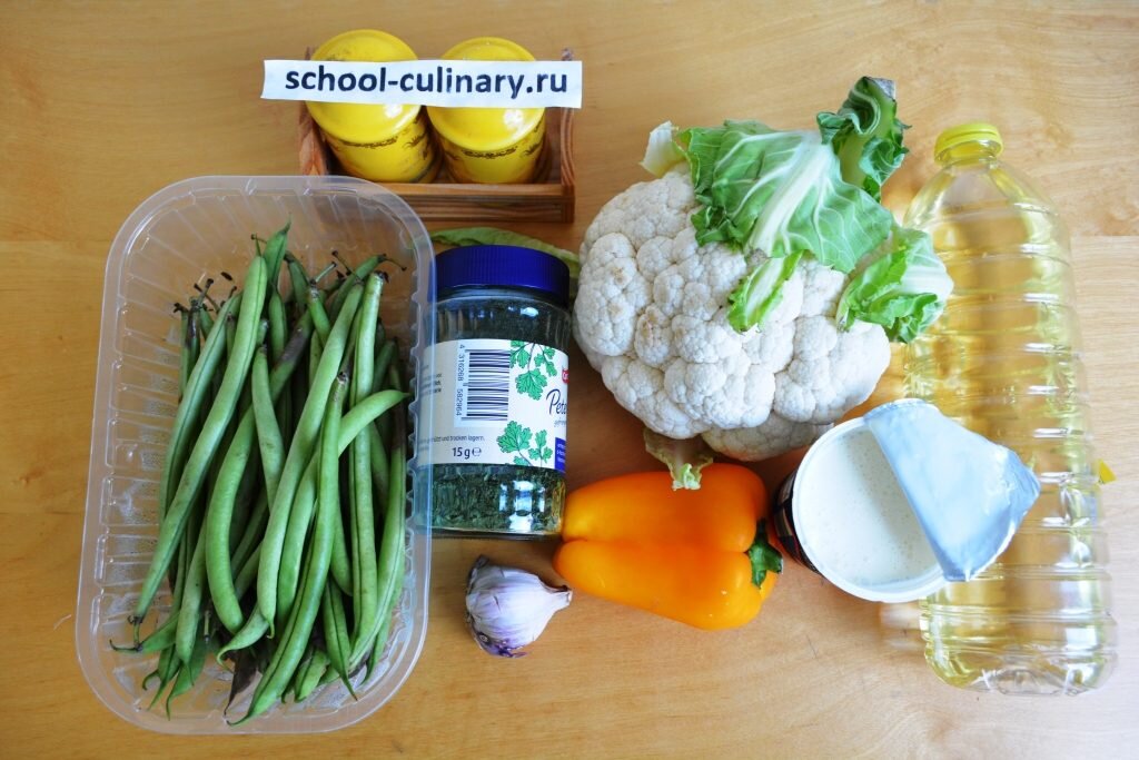 Цветная капуста со стручковой фасолью в сливках замечательно дополнит основное блюдо. При этом вполне может заменить основной гарнир, если вы планируете легкий ужин. Оно богато витаминами и клетчаткой и обязательно понравится всей вашей семье. Ингредиенты: Приготовление: Капусту помыть, отделить соцветия и нарезать их небольшими кусочками. Тем временем фасоль промыть, удалить сухие кончики и нарезать каждый побег на небольшие кусочки. Удобнее всего это делать при помощи ножниц. Выложить фасоль к капусте в сковороду. Перемешать. Перец помыть, удалить плодоножку с семенами и порезать мякоть на небольшие кусочки. Выложить перец в сковороду к остальным овощам. Перемешать. Потушить их вместе около 10 минут. Чеснок очистить от шелухи и нарезать небольшими кусочками. Добавить чеснок к овощам. Все посолить. Влить сливки и потушить блюдо еще 5 минут. Посыпать зеленью и подавать к столу в горячем виде.