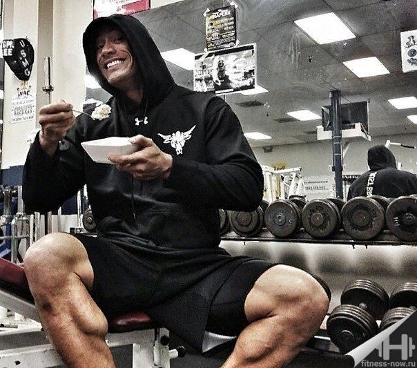 Семь приемов пищи в течении дня. Основным источником белка является рыба треска. 1 прием пищи: 300 грамм трески, 2 яйца, 2 чашки овсянки. 2 прием пищи: 200 грамм трески, 350 грамм картофеля, 1 чашка овощей. 3 прием пищи: 250 грамм курицы, 2 чашки риса, 1 чашка овощей. 4 прием пищи: 200 грамм трески, 2 чашки риса, 1 чашка овощей + 1 столовая ложка рыбьего жира. 5 прием пищи: 250 грамм мяса, 300 грамм печеной картошки и салат из шпината. 6 прием пищи: 280 грамм трески, 2 чашки риса, салат. 7 прием пищи: 30 грамм казеинового протеина, омлет из 10 белков, овощи + 1 ст. ложка рыбьего жира. Сумарное количество пищи: Белков – 360 грамм в сутки, а если посчитать ещё из углеводов то под 400 грамм белка за день. Углеводов – 500 грамм в сутки. По пропорциям у Дуэйна Джонсона, 3 грамма белка на каждый кг веса тела, и 4 грамма углеводов на каждый кг веса тела. Судя по пропорциям, углеводов в дневном рационе поглощаются по золотой середине, т.к. является идеально для того чтобы полноценно трениров