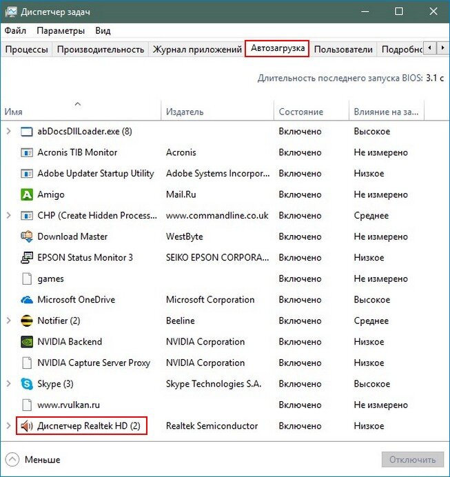 В первую очередь просмотрим автозагрузку системы. Запускаем Диспетчер задач и идём на вкладку «Автозагрузка», изучаем её опытным взглядом и делаем вывод, что пользователю из 15-ти программ, нужна в автозапуске только одна - Диспетчер Realtek. Доказываю почему, а затем покажу как это всё можно отключить.Примечание: Обратите внимание на колонку «Влияние на запуск», именно она даёт возможность оценить, насколько программа влияет на скорость загрузки OS. Если влияние приложения на запуск «Высокое», то значит программа может тормозить загрузку системы.