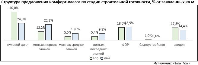 Ускорение темпов строительства привело к изменению структуры первичного предложения по стадиям готовности. На нулевом цикле представлено 24% московских новостроек комфорт-класса, хотя месяц назад эта цифра достигала 40% (по числу квадратных метров), сообщает компания «Бон Тон».