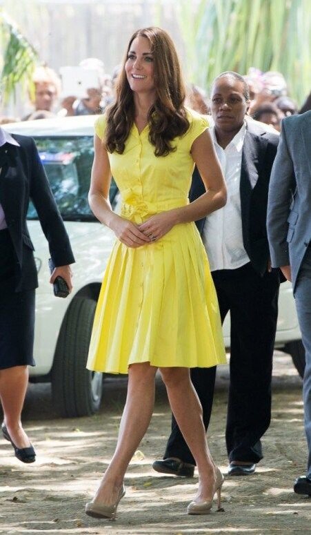 Герцогиня часто носит яркие наряды, особенно, если повод не очень официальный, однако, желтый цвет идет не всем и она им не злоупотребляет. Давайте вспомним те несколько раз, когда она носила желтый. В жаркий летний день для визита в Кабинет Министров Кейт надела легкое, ну абсолютно летнее платьишко. Образу придали официальность строгие туфли на высоком каблуке. Знаменитое "платье для Уимблдона" на Кэтрин в прошлом году. Это тоже посещение Кэтрин теннисного турнира в один из прошлых лет. Это же платье она носила в одном из зарубежных туров, во время которого принц Уильям сравнил это платье с бананом. Желтое же платье с элементами гипюра от Дженни Пэкхем Кейт выбрала для визита в Гейдельберг во время иностранного тура. Наверное ей удобно идти по брусчатке старинного немецкого города в туфлях на высоком каблуке. Нельзя не упомянуть и об этом желтом платье, ставшим для Кейт провальным, ведь его никак нельзя было надевать для визита на аэродром. Ух, горячая Кэтрин! Такое необычное платье