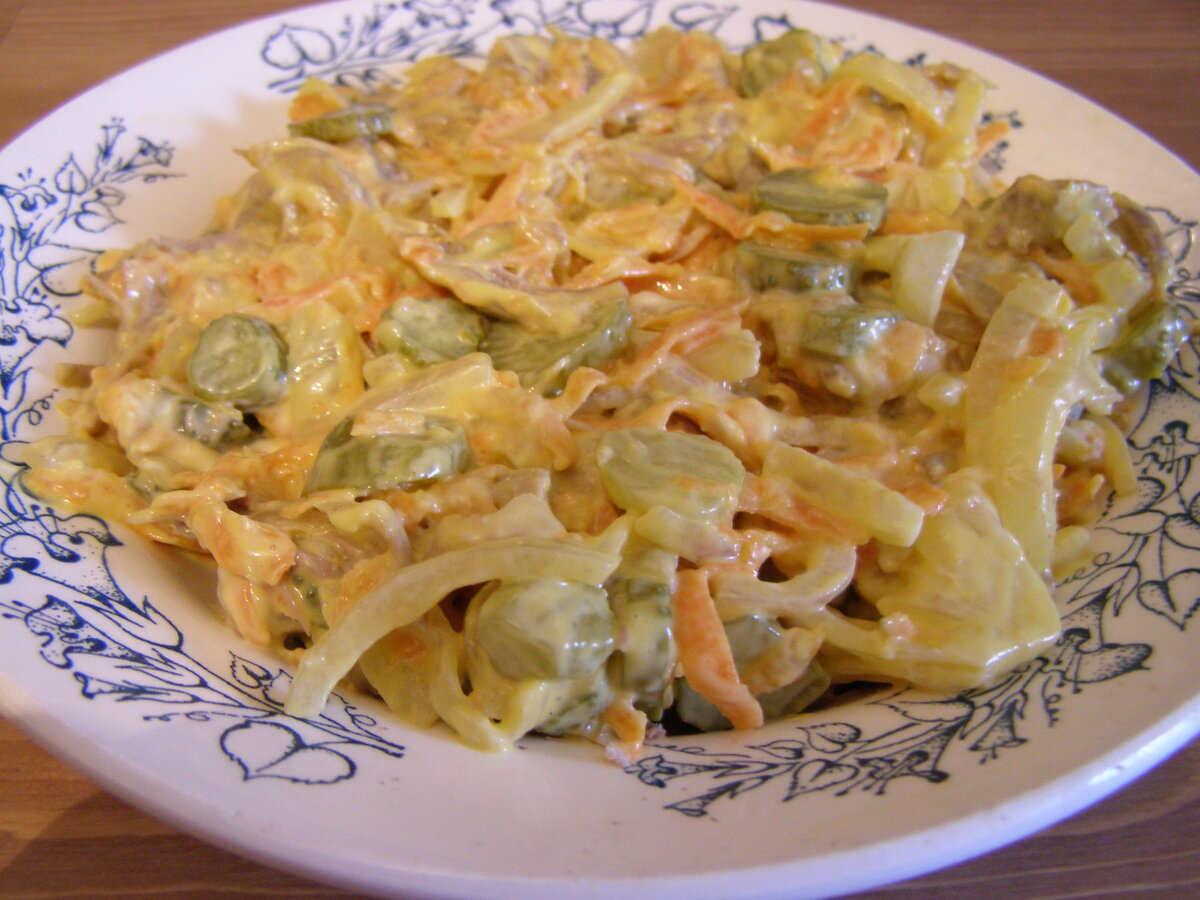Салат сытный и вкусный. Его можно использовать как основу для других салатов, можно добавить сухарики с чесноком и зелёный горошек.