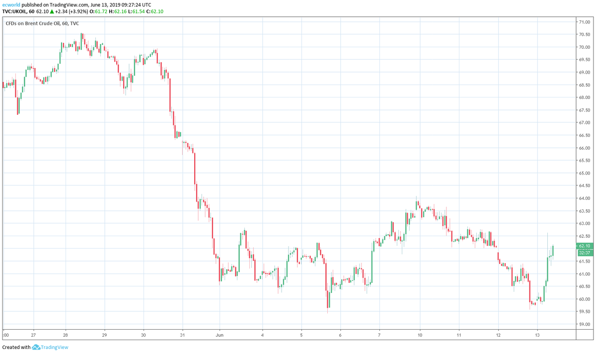 Достаточно было вчера нефти уйти ниже $60 и начать закрепляться там, создавая опасную (для цен) техническую конструкцию, как опять случилось «чудо»: РБК пишет: По предварительным данным, два нефтяных танкера пострадали от взрывов в Оманском заливе у берегов Ирана, сообщает иранский телеканал Al-Alam со ссылкой на источники. Тайваньская компания CPC сообщила, что ее танкер Front Altair пострадал в результате столкновения с неизвестным объектом, передает Reuters. Представители компании BSM сообщили, что экипаж второго танкера, Kokuka Courageous, был эвакуирован после того, как тот пострадал. Пятый флот ВМС США подтвердил, что два танкера получили повреждения в результате инцидента, который члены экипажа одного судна назвали атакой, пишет Bloomberg. Британская структура UKMTO, занимающаяся безопасностью на море, также сообщила, что в Оманском заливе произошел некий инцидент, не уточнив деталей, сообщает AP. На фоне сообщений о происшествии у берегов Ирана августовские фьючерсы нефти марки