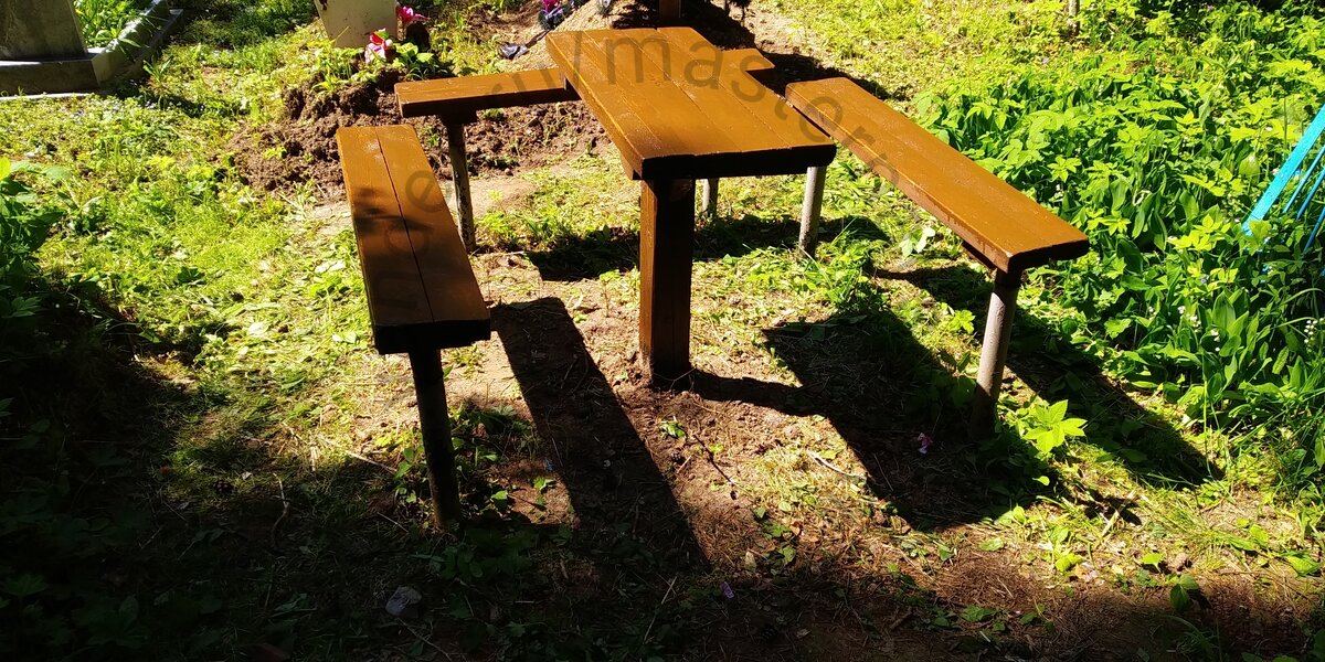 Места захоронения своих близких родственники обычно стараются облагородить. Столик и лавочка в этом вопросе, пожалуй, стали уже традиционными атрибутами. В настоящее время можно купить и установить столик из различных долговечных материалов, таких как камень, металл или бетон. Но стоимость такого изделия достаточно высока и не всегда по карману. Если приобрести столик нет возможности, это не беда. Его вполне можно сделать своими руками. Как? Рассмотрим ниже. Для изготовления столика будем использовать деревянные доски 50*100. Чтобы сделать столешницу с помощью ножовки отпиливаем доски длиной 95 см в количестве 4 штуки и скрепляем их двумя поперечинами с помощью гвоздей и молотка. В качестве опоры (ножки) стола будем использовать брус 100*100. Транспортировать столик удобнее в разобранном виде, поэтому собирать его будем непосредственно на месте установки. Для этого, с помощью лопаты выкапываем яму глубиной 0,5 метра и устанавливаем по центру брус. Перед тем как поставить опору