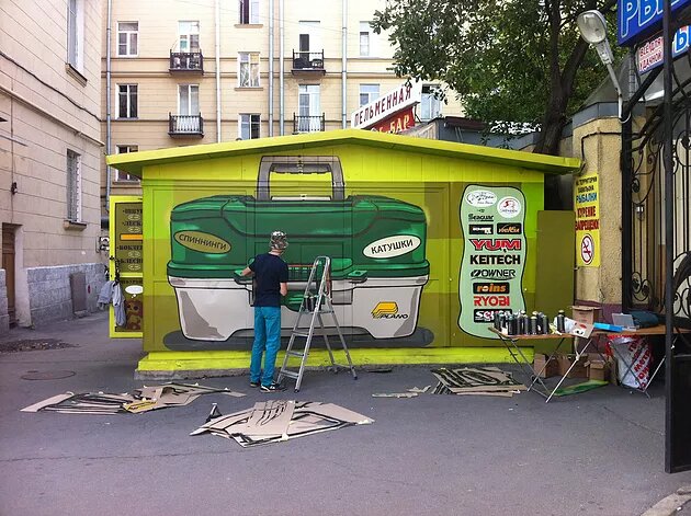 Сегодня мы рассмотрим с какими сложностями сталкивается художник при росписи фасада на примере "Рыбаловного магазина". И если есть окна и их нужно покрасить, как это сделать. Убедимся в удивительных возможностях граффити. Данную роспись заказали для улучшения внешнего вида магазина. Ларек состоит в основном из пластика, который уже около 10 лет находится под солнечными лучами, от чего он и пожелтел. 1) Первым этапом нужно очистить всю грязь с фасада ларька и убрать наклейки, которые прилипли так сильно, что без ножа их сложно снять. Для этого конечно необходимо отмыть водой ларек и в лучшем случае обезжирить поверхность обезжиривателем "для авто" или спиртом. Окна занимают большую часть поверхности, поэтому при разработке эскиза было решено оформить их тоже оформить. Но как же сделать чтобы краска не облезла?