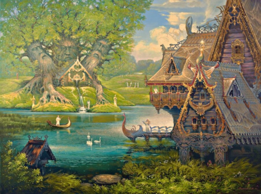 Посреди острова растет огромный дуб, в ветвях которого спрятан волшебный сундук, внутри которого находится заяц, внутри которого находится утка, внутри которого находится яйцо, внутри которого находится волшебная игла - душа Кощея. Сломай иглу, и он потеряет свою силу.