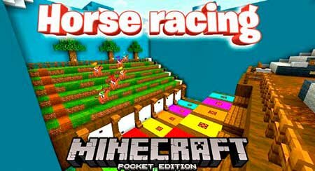Карта Horse Racing представляет собой весьма необычный ипподром. Сначала вам нужно собрать от 2 до 6 игроков Minecraft PE для соревнований. Однако, вместо того, чтобы оседлать лошадь и мчаться к победе вам нужно будет доказывать своё мастерство в стрельбе из лука.