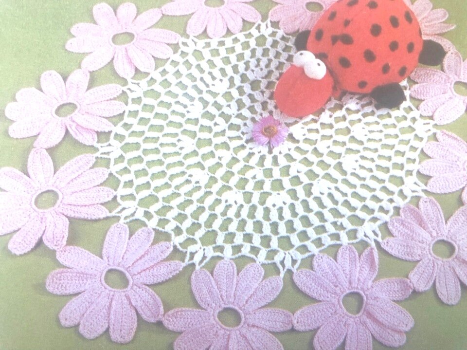 Размер: диаметр салфетки без ромашки ок. 33 см, диаметр ромашки ок. 11 см. Материалы: пряжа х/б, ок. 50 г белой, 55 г розовой крючок N° 1,5 Описание работы Ромашка: цепочку из 30 в. п. замкнуть в круг соед. ст. 1-й р.: 1 в. п. подъёма, 39 ст. б/н в получившееся кольцо. Ряд за-кончить с помощью соед. ст. Работу продолжить по схеме. Связать еще 11 ромашек, соединяя их за 1 лепесток по кругу. Нить отрезать. Середина салфетки: присоединить белую нить и вязать по схеме 1 и схеме 2 с 1-го по 12-й ряд. Салфетку накрахмалить, растянуть по размеру и оставить до высыхания. Слегка приутюжить.