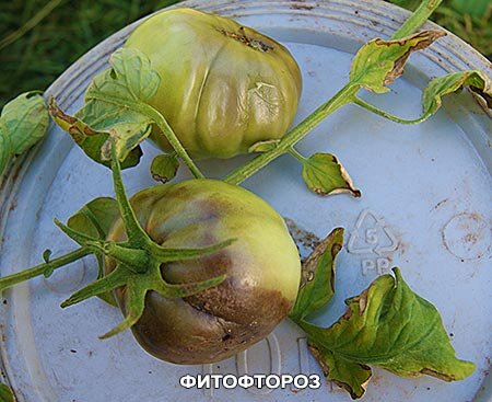 Фитофтороз или Фитофтора (Phytophthora infestans ) – заболевание томатов, широко распространённое на посадках томата, картофеля и других растениях семейства паслёновых. Обычно фитофтороз начинает появляться в последней декаде июля, хотя может возникнуть и раньше в неблагоприятное сырое холодное лето. Фитофтороз сохраняется на растительных остатках после уборки, поэтому следует все остатки уничтожать. Стараться не высаживать томаты в близи картофеля, не загущать посадки томатов, поддерживать оптимальную для томатов влажность. На стеблях и листьях томатов появляются коричнево-бурые пятна, которые быстро увеличиваются, особенно, в сырую погоду. Поражённые плоды охватываются расплывчатыми бурыми пятнами, сначала твёрдые, затем размягчаются. Фитофтору общепринято считать грибным заболеванием, но это не совсем так. У неё как у живого организма есть черты как грибов, так и простейших. Поэтому очень многие химические фунгициды на неё не действуют, что является достаточно большой про