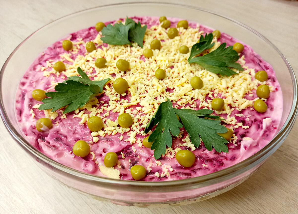 Для салата необходимо подготовить все ингредиенты.Мне понадобятся вареные яйца и отварная свекла.Заранее их отвариваю,остужаю и очищаю. Теперь беру селедку, и готовлю филе, далее нарезаю филе селедки мелкими кусочками. Репчатый лук очищаю, нарезаю мелким кубиком, кладу в миску, добавляю саль, сахар и уксус, заливаю лук крутым кипятком и убираю в сторонку мариноваться, минут на пять, Теперь когда все ингредиенты подготовлены собираю салат. Первым слоем на дно салатника натираю на крупной терке одно яйцо, вторым слоем выкладываю маринованный лук, третьим слоем кладу селедку и сверху смазываю майонезом. Далее четвертым слоем снова натираю остальные вареные яйца, сверху смазываю майонезом, пятым слоем выкладываю зеленый консервированный горошек, и последним слоем натираю на крупной терке свеклу, сверху смазываю сверху майонезом. Готовый салат убираю в холодильник настояться, перед подачей на стол украшаю яичным желтком, зеленым горошком и зеленью. Салат получился не только яркий, праздничный, но и очень вкусный.