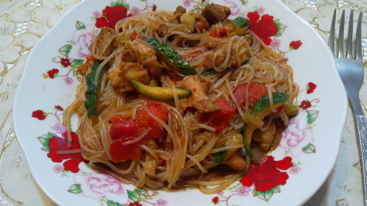 Привет дорогие читатели. В этой статье расскажу Вам как приготовить очень вкусный салат. Ингредиенты: Фунчеза - 200 гр. Огурец - 1 шт. Лук - 1 головка. Куриная груда - 300 - 350 гр. Болгарский перец - 1 шт. Зелень - для украшения. Паприка - 1 ст. ложка. Черный молотый перец - щепотка. Соль по вкусу. Соевый соус - 2 - 3 ст. ложек. Сахар - 1 ч. ложка. Способ приготовления фунчезы: Фунчезу кладем в кастрюлю, заливаем водой, доводим до кипения и варим 2-3 минуты до готовности. Затем охлаждаем фунчезу холодной водой. Что бы фунчеза не была слишком длинной, её можно разрезать ножом или ножницами. Очищенный лук, нарезаем полукольцами. Мясо курицы промываем и нарезаем соломкой или кубиками. Огурцы так-же моем и режим соломкой, точно так же поступаем и с перцем. В казане с разогретым маслом, обжариваем до золотистой корочки филе, затем к нему добавляем лук и обжариваем минуты 4. Затем к мясу и луку отправляем перец минуты на две, добавляем перец, паприку, соль. В казан к мясу и овощами,
