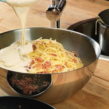 Энергетическая ценность на порцию * Калорийность рассчитана для сырых продуктов. ______________________________ Ингредиенты 2 порции ______________________________ Инструкция приготовления 20 минут 1. Вскипятите воду в большой кастрюле и сварите пасту до состояния аль денте. Обычно для этого нужно варить ее на минуту меньше, чем указано на пачке. ............................................. 2. Пока паста варится, растопите на сковороде масло и обжарьте на нем мелко нарезанные лук, чеснок и бекон. До мягкости и до отчетливого чесночного и жаренобеконного запаха. ............................................. 3. Снимите сковороду с огня и в глубокой миске взбейте четыре яичных желтка со сливками и тертым пармезаном. Посолите и поперчите смесь, еще раз взбейте. ............................................. 4. В готовые спагетти вывалите обжаренные с луком и чесноком кусочки бекона. Влейте смесь сливок, желтков и пармезана, перемешайте. И сразу подавайте, посыпав свеженатертым сыром и че