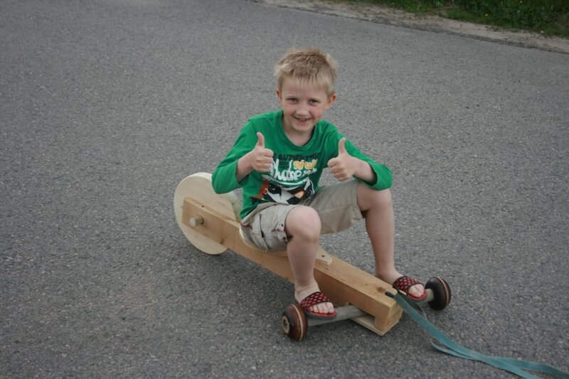 Создаем неведомое средство передвижения. Единственная цель - покататься. Всё. Для изготовления используем: Инструмент: Пила, циркулярная пила (можно заменить обычной), электролобзик, дрель, шуруповерт, шлифмашинка, фрезер (можно заменить стамеской). Материал: кусочки фанеры, кусок ступени, черенок от лопаты и брус 100х100. Техническое задание состояло всего из нескольких пунктов: машинка должна странно выглядеть, ехать за веревкой, управляться. Начинаем. Процесс. Шаг 1. Берем кусок ступени и делаем большое колесо. Фото достаточно информативны для дополнительных пояснений. Выпиливаем лобзиком. Красивый кривой гвоздик вытащили, по ходу дела, из куска ступени. Циркуль сделали сами. Скругление на колесе сделано фрезером и это единственный момент где он понадобился. Шаг 2. Берем брус и устанавливаем колесо из шага 1. Прорези пилим циркулярной пилой, а лишнее выбиваем стамеской. В качестве оси использован черенок для лопат. Что бы его вставить просверлили отверстие коронкой. аг 3. Делаем р