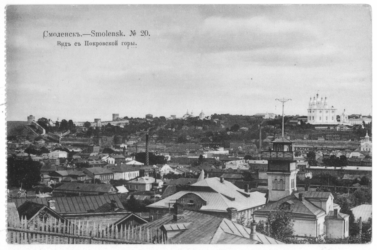Смоленск. Вид с Покровской г горы 1910 год. На переднем плане справа - здание 3-й полицейской части с пожарной каланчой (надстроена в 1893 г., не сохранилась). Подписывайтесь на наш канал, ставьте лайки, комментарии, делитесь в социальных сетях. @old.fotosmolensk