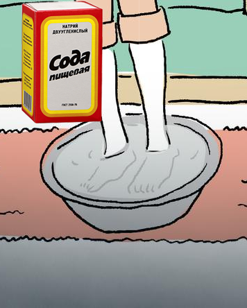 Добавляем в тазик с горячей водой 3-5 столовых ложек пищевой соды и погружаем наши ножки в воду на 15-20 минут. В это время вы можете почитать книгу или посмотреть телевизор.