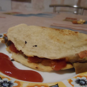 Энергетическая ценность на порцию * Калорийность рассчитана для сырых продуктов. ______________________________ Ингредиенты 5 порций ______________________________ Инструкция приготовления 1 час 30 минут 1. Из муки, масла, соли и воды замешиваем тесто. Раскатываем тонко (из этого количества теста у меня получается 5 лепешек). ............................................. 2. Затем все остальные ингредиенты режем, смешиваем и жарим на сковородке около 16 минут (примерно, а вообще жарим, пока не закипит и после этого еще 5 минут). ............................................. 3. В лепешки накладываем начинку и запекаем до готовности. ______________________________ Можно подавать с соусами сальса и базиликовым.